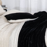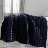 A stunning, lightweight, reversible, padded throw in gorgeous black silk velvet and natural linen. Features traditional, hand done, checked topstitching that matches the silk velvet and creates delicate rows of individual black stitches, visible on the natural linen.