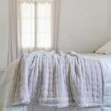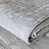 A stunning, lightweight, reversible, padded throw in gorgeous oyster silk velvet and natural linen. Features traditional, hand done, checked topstitching that matches the silk velvet and creates delicate rows of individual oyster stitches, visible on the natural linen.