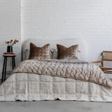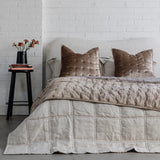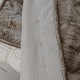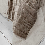 A beautiful, lightweight, reversible, padded throw or bed runner in soft, mocha brown cotton viscous velvet with a light brown finely striped cotton backing. Features traditional, machine done, embroidered spot stitching in mocha that creates a pattern of individual spot stitches, visible on the velvet.