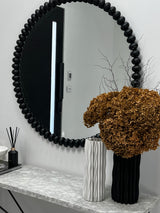 A statement of modern elegance, the Asma round wall mirror in black creates a striking feature with its bold 105cm circular iron frame embellished with oversized egg-shaped beading. Effortlessly timeless, the striking simplicity of the Esme round wall mirror easily blends with both contemporary and classic interiors. Also available in gold leaf finish.