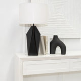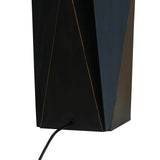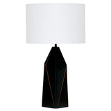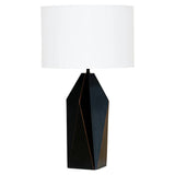 Elevate your design with this captivating contemporary masterpiece. Crafted with precision, its iron, antique black finish base complements diverse settings effortlessly. Complemented by a faux white linen drum shade, this geometric multi-faceted lamp exudes modern allure. Available in a brass or antique black finish.