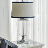 Brighten up your room with coastal charm and sophistication courtesy of our Charlotte Glass and Nickel Lamp. With its sleek glass base, crisp white linen shade, and Hamptons-style navy trim, this lamp effortlessly blends timeless elegance with modern flair. Crafted from high-quality materials, it promises to add a touch of refinement to any room, whether placed on bedside tables, living room consoles, or office desks.