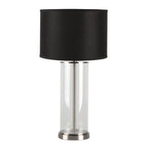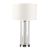 The Nala Table lamp is a modern glass table lamp and would be a sleek addition to any space. Features a nickel finish metal rod encased in a clear glass cylinder base trimmed with matching nickel metal.